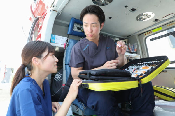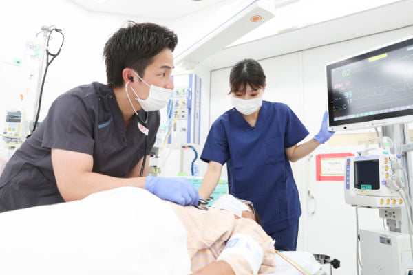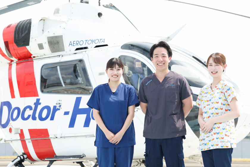 先輩 当院はドクターヘリを活用したプレホスピタル事業で、重篤な患者さんを迅速に搬送し、救命治療に尽力しています。災害や事故現場では、ドクター、警察、消防といった多職種と協働し、情報を共有しながらインホスピタルへつなぎ、各部署と連携して救命治療にあたります。
