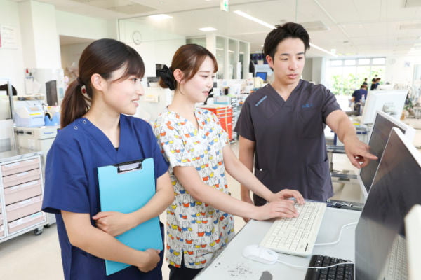 先輩 当院は高度救命救急センター、総合周産期母子医療センター、小児救命救急センターが整備された三次救急医療機関です。私が入職したきっかけの1つは、ドクターヘリに魅力を感じたことです。2年目に希望していた現部署へ異動し、今9年目です。現在は教育担当、業務リーダー、フライトナースとして活動しています。同じ部署のAさんは新人時代から見ていますが、着実に力をつけ、成長しましたね。