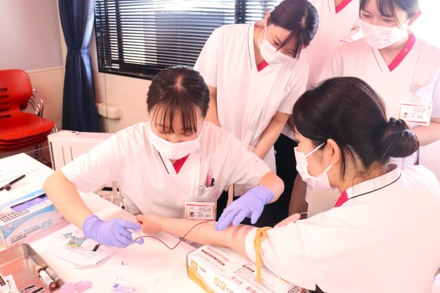 プリセプター制により、新人一人ひとりに固定した先輩看護師による臨床現場での支援を行います。また、一人ひとりのペースに合わせて無理のないようチームスタッフ全員で新人をフォローするよう努めています。同期入職の多職種合同の研修を定期的に実施することで、専門職として心構えができ、チームワークが築けるように関わります。