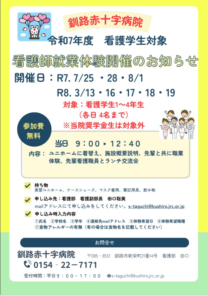 | 内容 | 釧路赤十字病院では、3月に就業体験を開催いたします。 希望部署での就業体験、先輩看護師との交流会を予定しております。 当院にご興味をお持ちの方はどうぞお気軽にご参加ください♪ 皆さまにお会いできるのを楽しみにしています! |