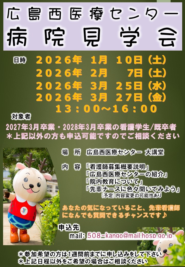 | 当日の持ち物 | ☆サージカルマスク ☆筆記用具 ☆院内を歩きやすい靴(ナースシューズなど) |