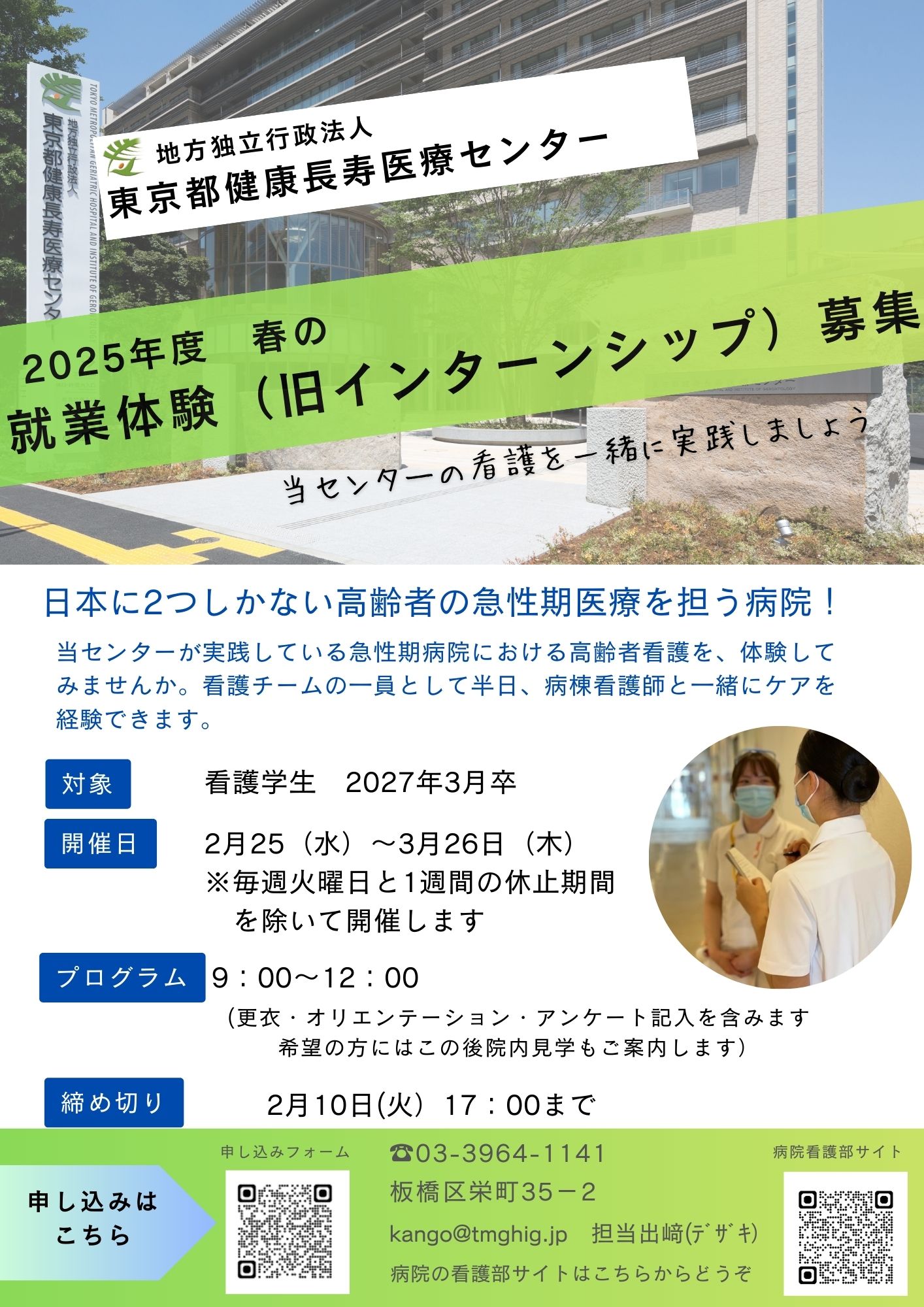 | 内容 | 日本に2つしかない!高齢者看護×急性期医療を体験しませんか。 高齢者の看護は、私たちがケアするだけでなく私たちがケアされることもあります。 短い時間ですが、当センターの看護師と一緒に就業体験をすることで あなたの大切にしたい看護が見つかるかもしれません。 急性期医療もしたい、そして高齢者看護が好き という方は、ぜひ当センターの看護を体験しに来てください。 午前中半日の体験コースですが、ご希望される方には終了後に病院見学も実施しています。 開催予定:2月25日(水)~3月26日(木)までの火曜日を除く平日 プログラム:9:00~12:00(更衣・オリエンテーション・アンケート記入を含む) 終了後希望があれば院内の見学にご案内します。 体験の希望する日を、第3希望まで選んでいただき日程を調整しますので、 お手数ですが、第一希望日を選択した後は、備考欄に第2希望日・第3希望日をご記入ください。 また体験の希望診療科を下記の中から選び、備考欄に第3希望までご記入ください。 「内科系メイン病棟・外科系メイン病棟・精神科・手術室・ICU/CCU(特定集中治療室)・SCU(脳卒中ケアユニット)」 ご連絡いただいた方には、登録いただきましたメールにて詳細をご案内します。 ※ 予定変更やキャンセルの連絡もメールでのやり取りでお願いします。 |