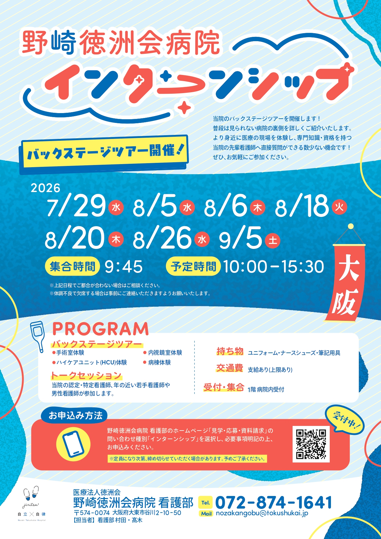 | 内容 | 野崎徳洲会病院のバックステージツアー 普段見れない手術室での見学・体験、またHCUでの看護についてなど経験できます。 HCUならではの超急性期患者さんの看護場面を見ることが出来ます!! 認定特定看護師や先輩看護師との座談会も開催します! なかなか実習では体験出来ない場所ですのでどうぞご参加ください☆ |
